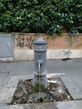 Italy stands out for having one of the most extensive networks of public drinking fountains in Europe, known as “nasoni” (big noses) which offer free access to potable water throughout urban areas. While Germany has around 1,300 public drinking fountains nationwide[3], Rome alone boasts over double this amount. These distinctive cast-iron fountains, typically weighing around 100 kg, feature decorative caps with plant motifs, wolfs or inscriptions, becoming beloved symbols of the city. Beyond being a source of hydration for passersby, especially during warm summer days, they are also integral to daily life of street cleaners filling buckets, people leaving messages, and gelato-sticky hands being rinsed clean.